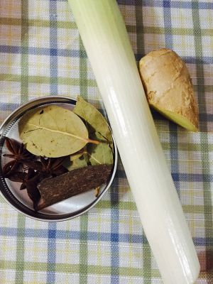 将排骨捞出,放入所有食材,加入少量花椒粒,生姜片,盐,料酒,添水至末过食材,小葱打结放最上,加盖开炖,大火煮开后改小火炖1.5小时