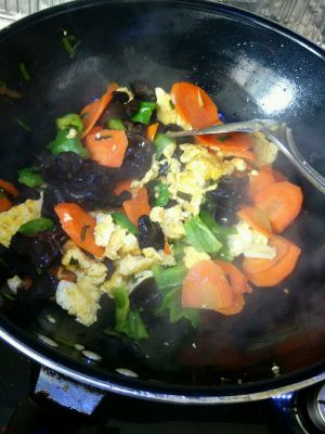 鸡蛋炒熟后盛出,在放入木耳翻炒,木耳至八成熟后,再倒入盛出的鸡蛋,放盐和作料进去,就做好啦~~