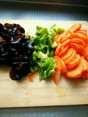 胡萝卜切片,青椒切小块,木耳泡发撕小朵
