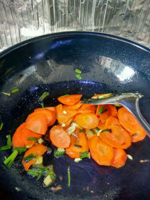 放油爆香葱花和蒜末,放胡萝卜略翻炒,加点水焖一会,不然不会烂。