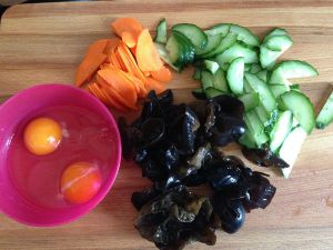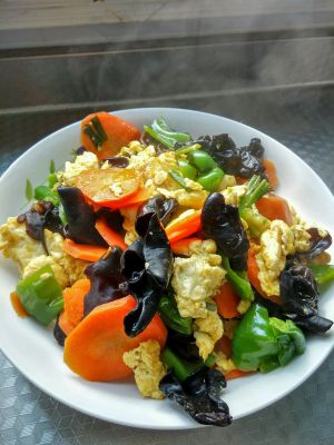 锅烧油,葱蒜炝锅,下去黄瓜木耳胡萝卜翻炒,加盐味精鸡精调味,翻炒下入鸡蛋,来点老抽调色翻炒均匀出锅装盘即可