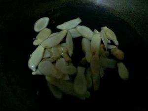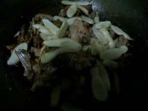 锅烧热放入蒜暴香倒入鸭肉炒到有些金黄