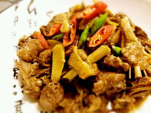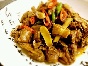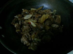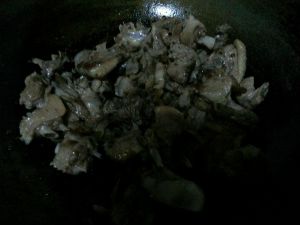 子姜炒干水后加入鸭肉和油,盐,酱油翻炒片刻。