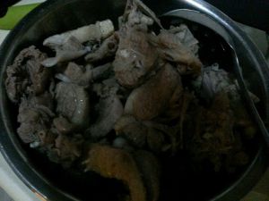 加滚水或温水,加少许盐,因为豆瓣酱咸所以不用加太多盐,鸡精,酱油,老抽料酒调味,倒人高压锅12分钟