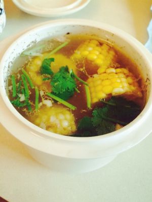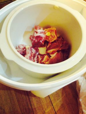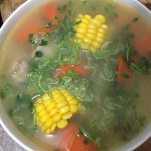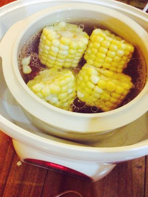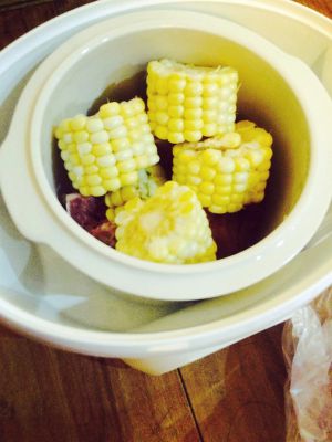 放排骨,放开水 滴两滴醋。炖半小时再放玉米胡罗卜。炖上一小时放盐鸡精美汤完成。