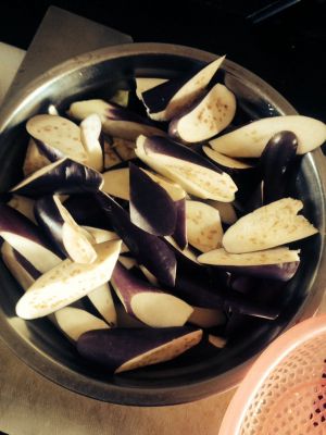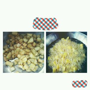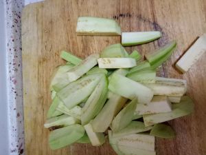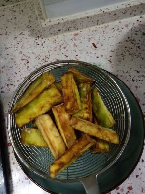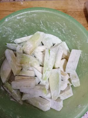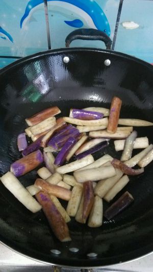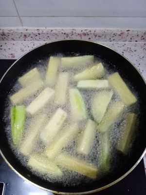 锅里倒入油,放入裹了鸡蛋面粉的茄子,炸成块,捞出。剩适量油在锅里。