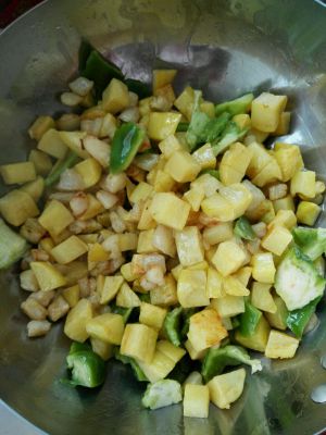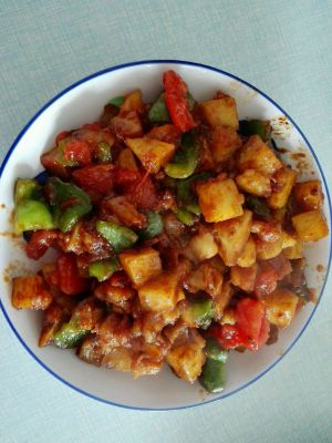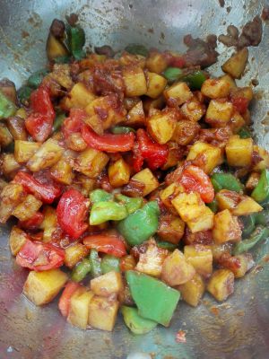 在锅里放入青椒,翻炒一下放入炸好的茄子土豆,在翻炒一下,加入适量老抽,白糖