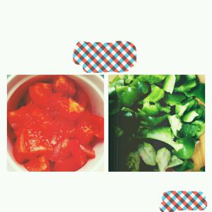 将西红柿去皮以后切成小块,青椒掰成小块,放在一边备用