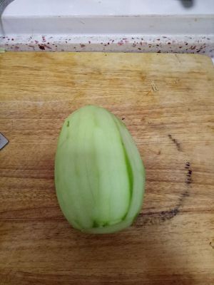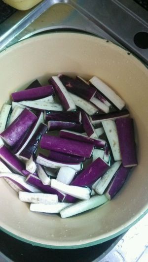 茄子冼干净滚刀切薄块,放进一盘干净的清水中浸泡,预防变色!