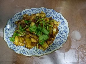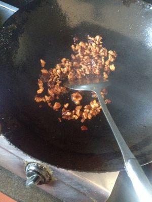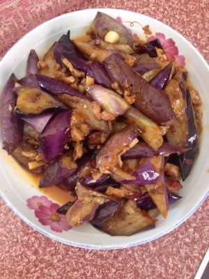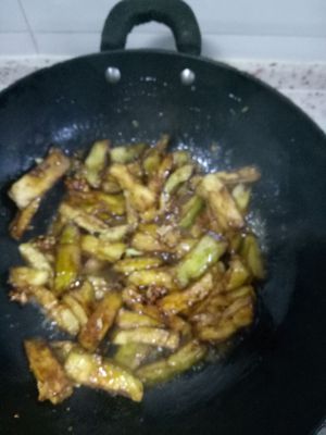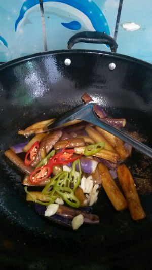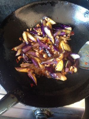 锅内放入两勺油,爆香干辣椒和蒜,然后放入炸好的茄子和肉片。依次加酱油、糖、酒,翻炒一下。