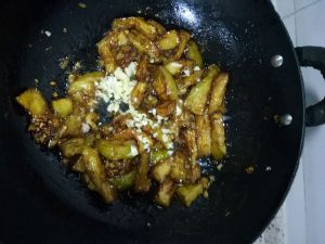 勾点水淀粉,倒入茄子里,完了翻炒,把剩下的大蒜末放进去,加点醋翻炒,