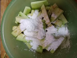把切好的茄子放水里泡一会,拿出放在盆里,撒盐搅拌,可以放其他佐料,腌制5分钟。