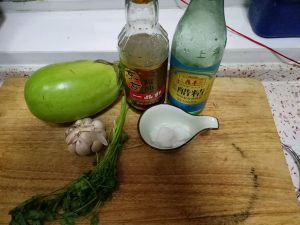 茄子一个,蒜一头,香菜一棵,酱油,醋,糖,盐,淀粉,鸡精适量