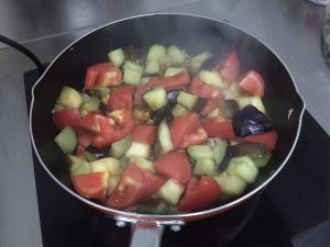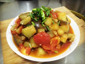 将油放入锅内,热后下入葱姜蒜末炝锅,投入肉片、酱油炒匀,加入水300克,放入精盐、味精、西红柿、炸茄子,开后勾芡即成。