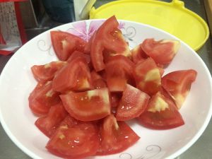 将 猪肉切成小薄片,放入盆内,加入水淀粉25克、精盐5克,拌匀上浆,用热锅温油滑散,捞出沥油;西红柿洗净切成小块;茄子去皮用刀片成小块,用热油炸成金黄色,捞出沥油。