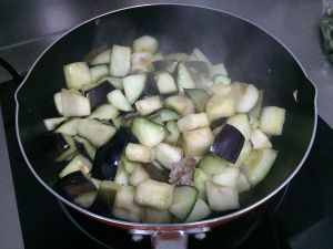 蒜蓉炝锅,加入茄子块,油适量多加一些