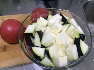茄子滚刀。面粉,鸡蛋打糊状,裹在茄子上