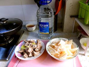 排骨洗干净,凉水下锅焯水,加入料酒一起煮