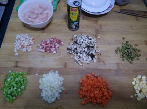 将胡萝卜,蟹肉棒,辣椒,洋葱,荷兰豆,香菇虾仁切丁备用