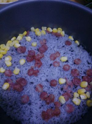 玉米粒,腊肉,大米,黑米蒸好备用