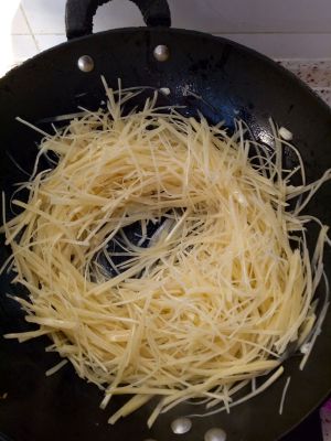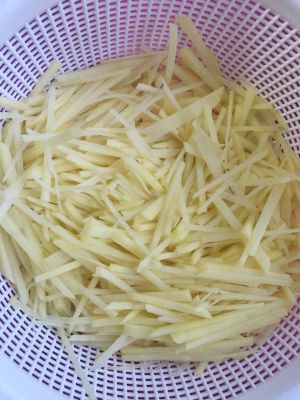 土豆切或刮成丝,然后放入冷水简单淘一下,营养有些损失,但是鱼和熊掌不可兼得,为了俺的舌头,口感好哦