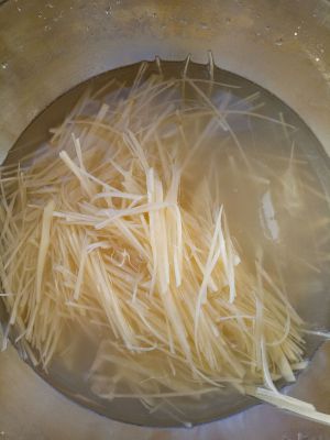 先将土豆去皮切成丝,放进凉水里浸泡。