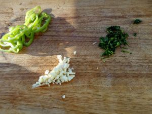 把大蒜切,辣椒香菜切好备用