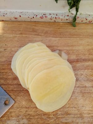 土豆去皮,切成两张纸币那么厚的薄片,