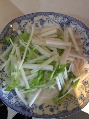 五花肉切丝,加入料酒,生抽,十三香,盐,腌一会儿。