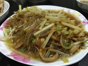 锅里放适量的油,油烧开先把蒜片和葱姜放里面爆锅,香味出来就在锅底撒一点盐(会使肉不粘锅)然后马上放肉,炒到肉变色,撒一点酱油,然后把芹菜放里面继续炒,感觉芹菜快好的时候再把粉条放入翻炒,再撒些酱油,让粉条上色,这时候再在锅里添一盘底水,使粉条更顺滑,常常咸淡,根据自己口味调一下,收汤,装盘(全程都用大火就ok)