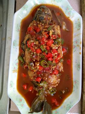 留底油捞出杂质,放生姜沫大蒜沫炒香,豆瓣酱炒出红油,接着放生抽,料酒,青红辣椒炒香,然后放清水烧开后把鱼放进锅里