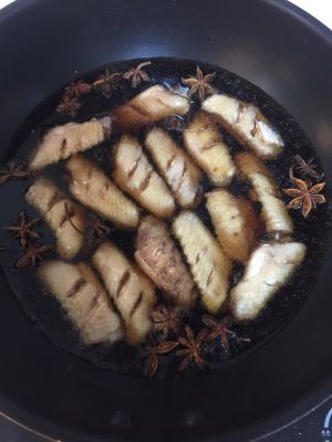 放可乐,将鸡翅淹没,温火炖。直至可乐收汁,停火。