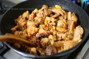炒到五分熟左右下鸡公酱料包炒均匀,加水慢炖十五分钟。看水收的剩不多时放洋葱青椒(我喜欢吃脆点的洋葱)还加了点白酒继续翻炒一下,大火收汁