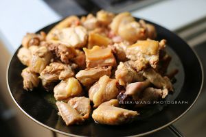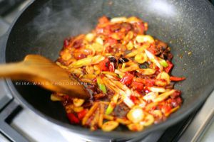 油入锅放干辣椒、姜、蒜下去炒香,然后倒进提前先用料酒(我重口味,喜欢用白酒)、盐腌过半小时以上的鸡肉块翻炒