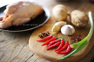 土豆去皮切块,蒜头切片,葱姜切丝、干辣椒切段、大公鸡洗净剁块备用;
