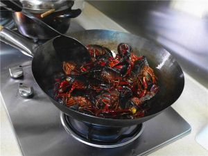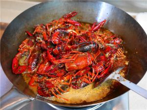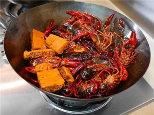 放油,多一点,七成热时放入麻椒和红辣椒蒜瓣姜片煸香,放入郫县豆瓣炒香后倒入龙虾翻炒,倒入啤酒、放入香料,烧开后放入冰糖,放盐和鸡精调味,小火炖20分钟左右,大火收下汁(稍微收下即可)