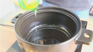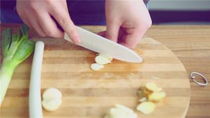 取出电饭煲内胆,在里面加少许油,姜蒜铺上