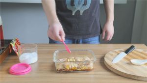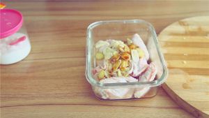 鸡翅、料酒、生抽、胡椒粉、葱、姜、蒜盛入保鲜盒。