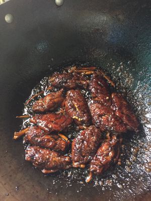 把不粘锅烧热,加入小许油,把鸡翅正面向下放入锅,小火煎黄,使之受热和上色均匀