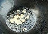 加少量油,转小火,放几颗花椒调味,待油冒烟就放入切好的蒜蓉、姜。
