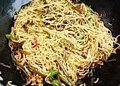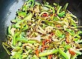 放海带丝翻炒一会,再放青红椒丝,翻炒一下。