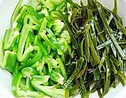 肉丝用料酒和酱油腌10分钟。青红椒洗净切条儿,海带丝洗干净备用。
