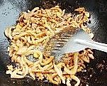 锅内加油八成热,爆姜蒜,炒香后加入肉丝。