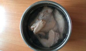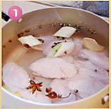 2️⃣锅中加冷水,葱姜段,花椒,八角,适量料酒,把脱骨后的鸡腿冷水下锅,大火煮开后30分钟出锅