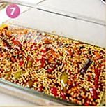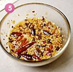 把油锅中的干香料捞出,油温烧热约9成,分次倒入干辣椒的碗中搅拌均匀。