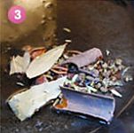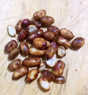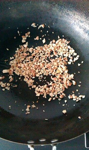 把花生弄碎(切也好,拍也好……自己想办法)放锅中慢慢炒。