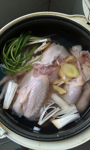 水烧开,将鸡和生姜,葱炖五分钟,然后关火焖十五分钟断生,然后捞出放冰水里面。