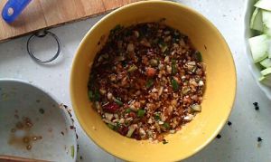 葱蒜全部切碎,油炸花生和熟芝麻捣碎、准备一个大碗,放入葱末和蒜末,在加入所有的作料拌匀为调味汁。