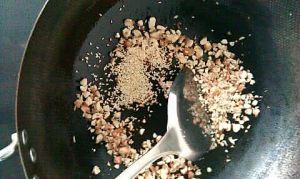 花生出香味后,放白芝麻继续慢炒,变黄后盛出。
