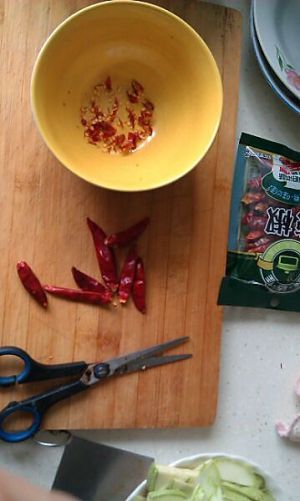 煮鸡的空档,准备辣椒油,辣椒最好买辣椒末儿,由于忘买了我就用干辣椒剪碎了代替。